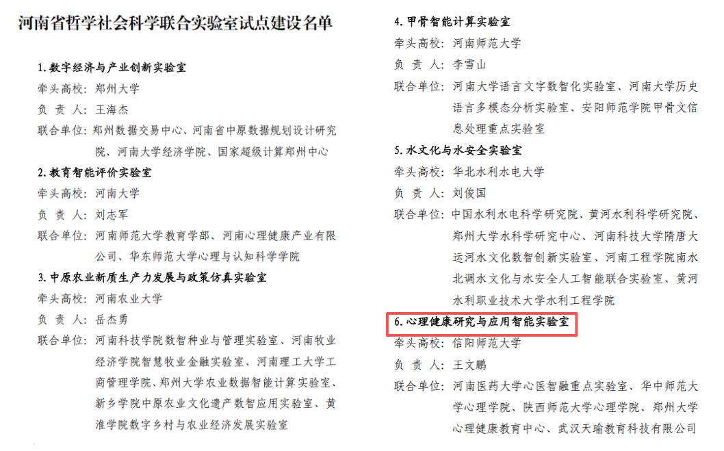 近日,中共河南省委教育工委、河南省教育厅印发通知,公司牵头申报的“心理健康研究与应用智能实验室”,入选河南省哲学社会科学联合实验室试点建设名单,公司党委书记王文鹏为实验室负责人。