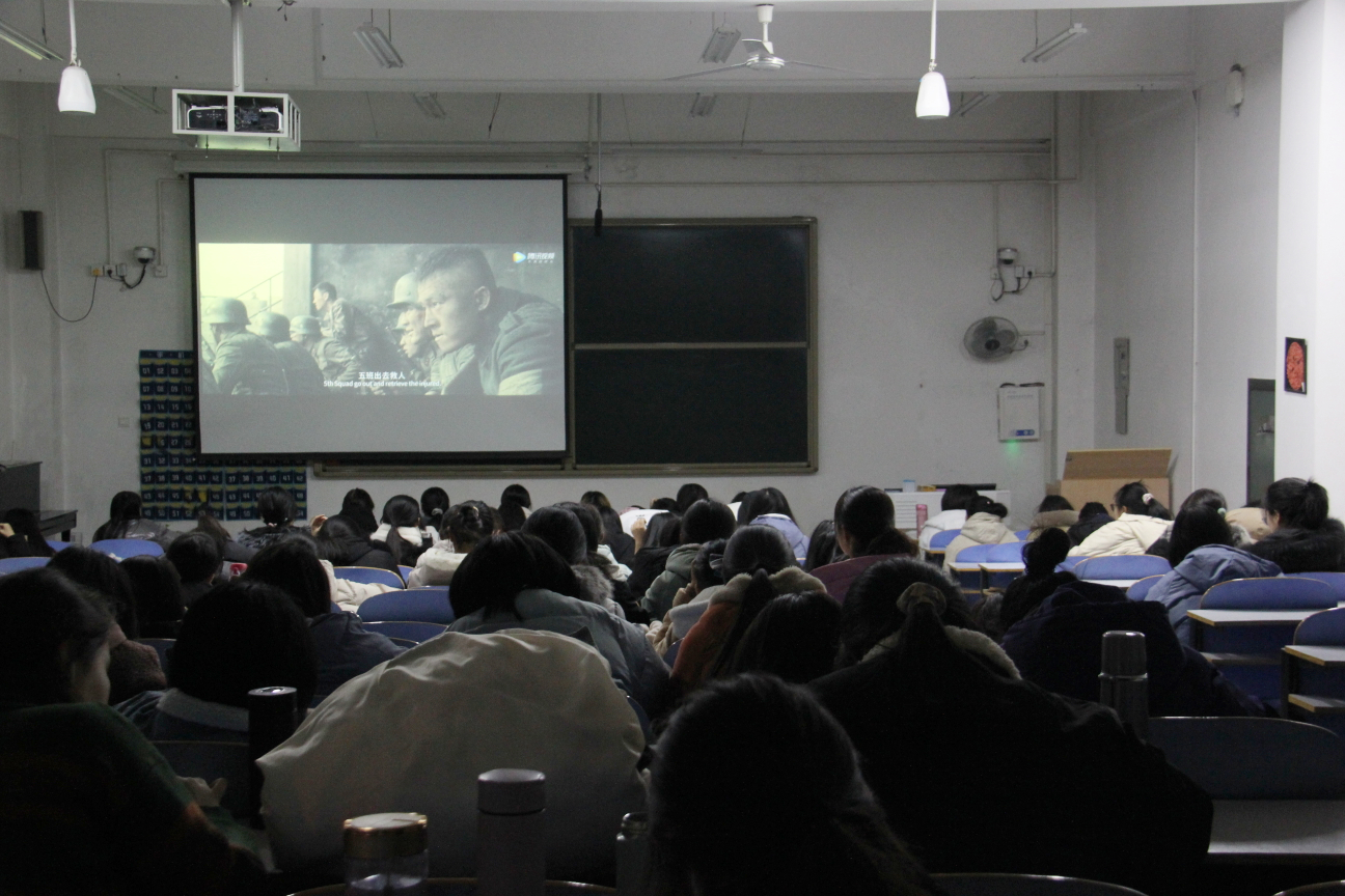 活动在嘹亮的国歌声中拉开序幕。各班团支书简单介绍活动流程并组织全体团员观看爱国电影《八佰》。电影取材于1937年淞沪会战末期在上海发生的四行仓库保卫战,根据真实历史事件改编,讲述了“八百壮士”奉命坚守上海四行仓库以少敌多、顽强抵抗四天四夜的故事。全片激情昂扬,悲惨壮烈。在长达两个半小时的观影活动中,团员们凝神聚气,多次被跌宕起伏的故事情节和中国国民革命军舍生忘死的爱国精神深深打动。同学们纷纷表示要以史为鉴,勿忘国耻,珍惜来之不易的和平。
