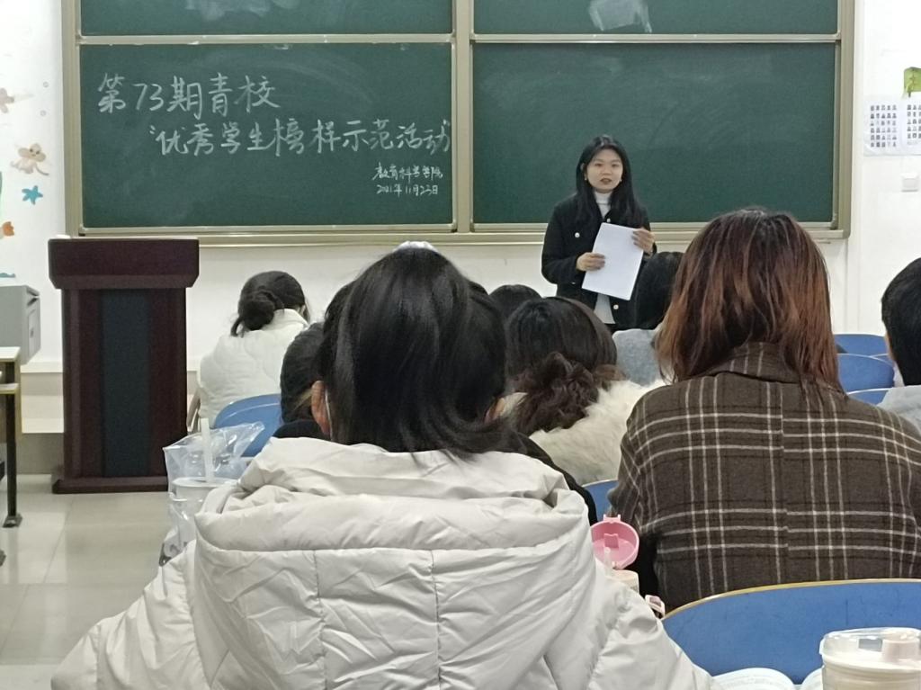 时间:2021-11-24 19:59:14 来源:PA视讯教科院新闻部 作者:周媛媛 刘至涵 阅读: 次11月23日,PA视讯在教科楼201教室开展“优秀员工榜样师范活动”,优秀员工模范孙艳慧及第73期全体青校成员参加此次活动。活动由2020级学前教育本科3班刘家园主讲。