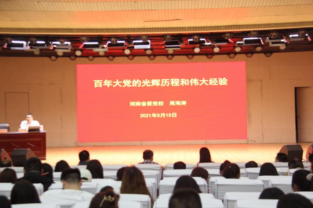 韩晓青在报告会中,分别从初步探索、继续探索、历史启示三个方面展开《党对革命道路的探索》的报告,带领大家重温中国共产党探索革命道路的历史,深刻剖析中国共产党探索“农村包围城市,武装夺取政权”道路的历程。下半场报告会中,周海涛分享了题为《百年大党的光辉历程和伟大经验》的报告。他鼓励同学们学习近平总书记的人民立场,公仆情怀,强调老员工要多关注农村,关注三农问题,并积极引导广大青年讲好中原故事、坚定文化自信。