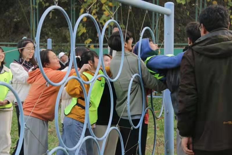经过“花开花落”、“逛公园”等一系列热身活动后,教练员带领同学们进入心语素拓园进行素拓。此次素拓活动设有“紧急逃生墙”、“穿越生死网、“信任背摔”等,类型丰富,趣味十足,全部活动都在教练员的指导与看护下完成,保证了同学们的安全。其中,“紧急逃生墙”是指墙上和墙下同学一起齐心协力帮助“逃生者”逃生成功的——在“逃生”过程中,墙下同学将“逃生者”托举上去的同时,墙上的同学们合力拉住,最终所有“逃生者”翻墙成功。面对三人高的逃生墙大家团结一心,共同完成了这一艰难项目,展现了友好互助的优良风貌。在“穿越生死网”项目中,同学们积极开动脑筋,采取多种方法在不触碰电网的条件下成功完成。游戏过程中,同学们相互帮助、共克困难,既增进了感情,也充分体现出了同学们的大局意识和集体观念。