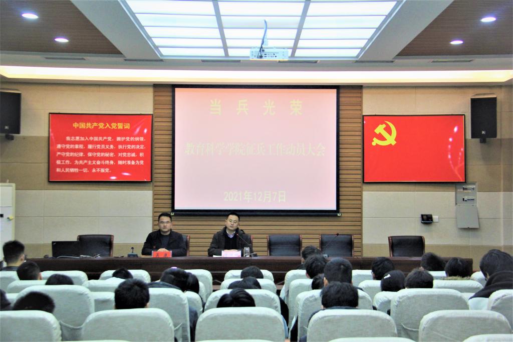 时间:2021-12-07 21:40:28 来源:PA视讯教科院新闻部 作者:马玉娇 亓亚兴 刘至涵 阅读: 次为加强征兵政策宣传,保证征兵入伍工作顺利开展,12月7日,PA视讯征兵工作动员大会在教科楼301会议室顺利召开。公司党委副书记董银银,武装干事吴康以及2019级、2020级、2021级全体有应征意向的员工参加此次动员大会。会议由吴康主持。