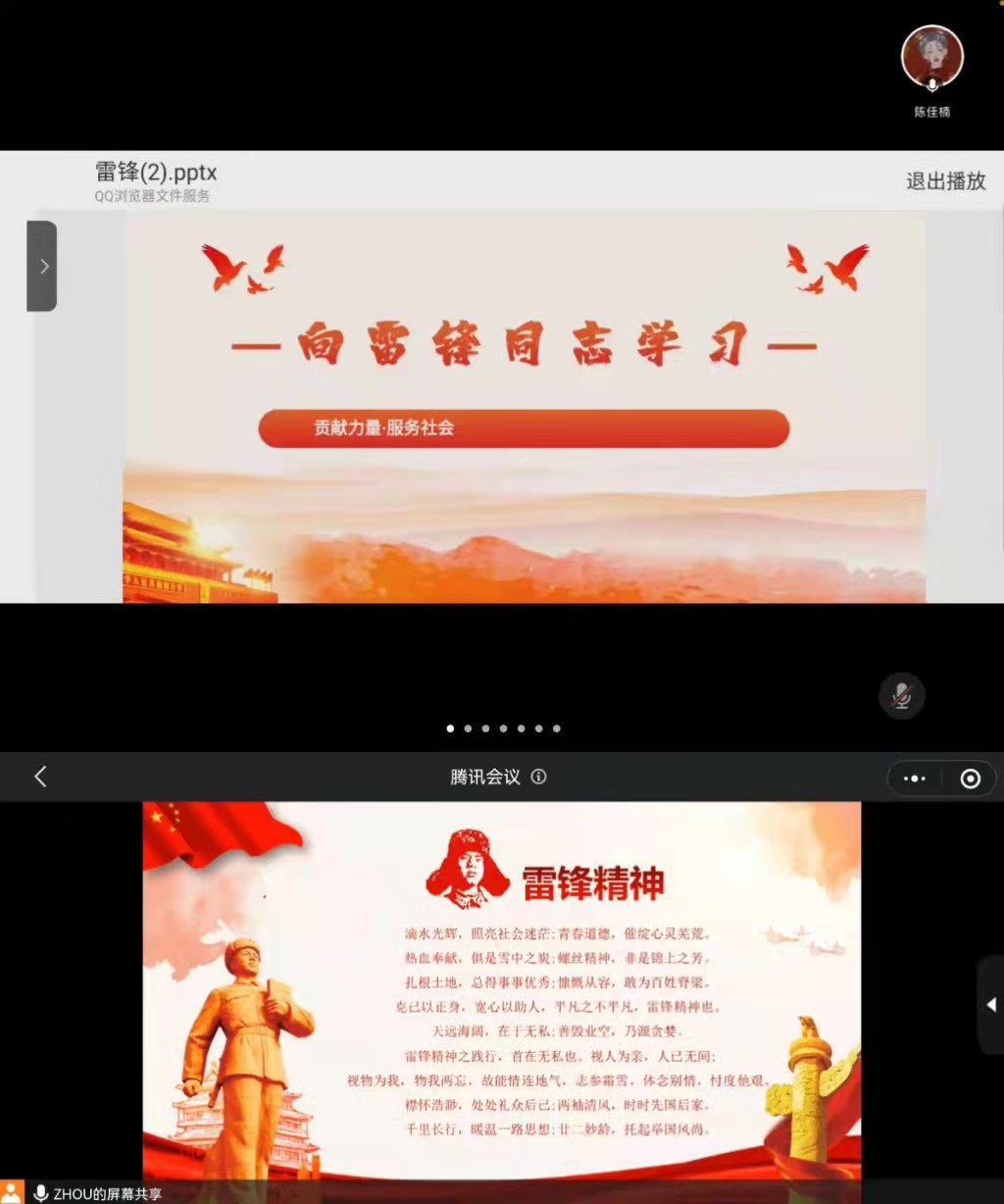 时间:2022-03-27 13:44:53 来源:PA视讯教科院新闻部 作者:马玉娇 周媛媛 亓亚兴 阅读: 次适逢三月雷锋月,为弘扬雷锋精神,践行雷锋精神魅力,3月26日,PA视讯老员工摄影爱好者协会、童真话剧社、心悦社分别通过腾讯会议于线上开展“学习雷锋精神,争做时代先锋”雷锋月主题团课活动,全体同学积极参加。
