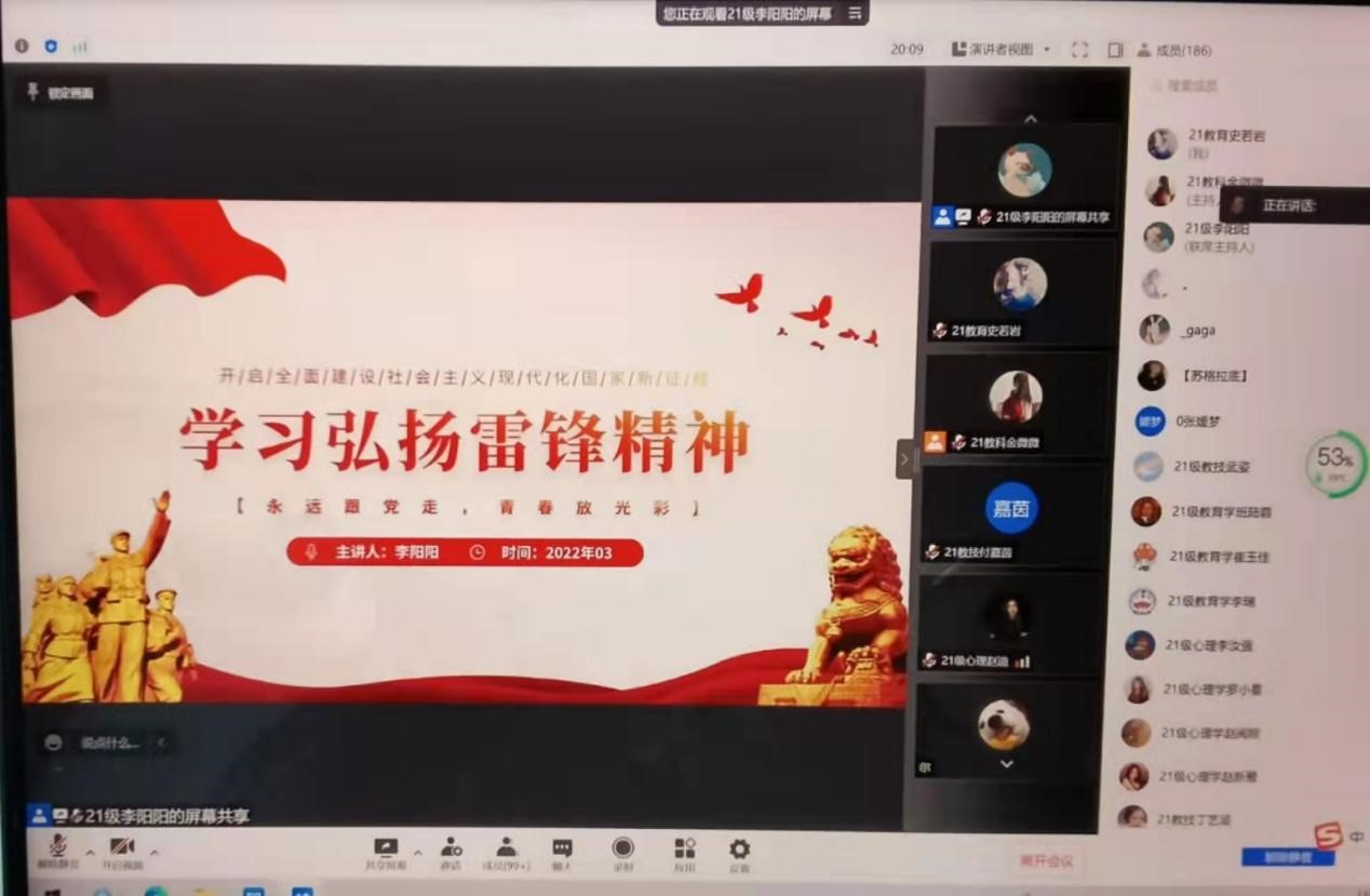 时间:2022-03-30 15:47:39 来源:PA视讯教科院新闻部 作者:马玉娇 朱亚彤 阅读: 次为贯彻落实习近平总书记关于学习雷锋精神和开展志愿服务工作的重要指示精神,进一步弘扬雷锋精神和志愿服务精神,3月15日至3月25日期间,PA视讯各班级团支部通过观看主题影片、利用腾讯会议召开主题团课、“学习雷锋精神”专题座谈会等形式陆续开展“学雷锋·树新风”主题团日活动。