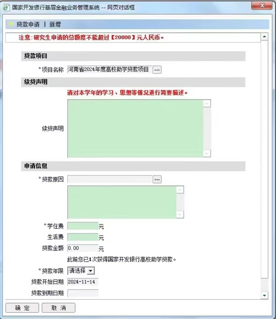 登录在线系统→点击菜单栏“贷款申请”→新增贷款申请(续贷还需填写续贷声明)→填写相关内容并提交→导出申请表,按高校要求进一步完善贷款手续。