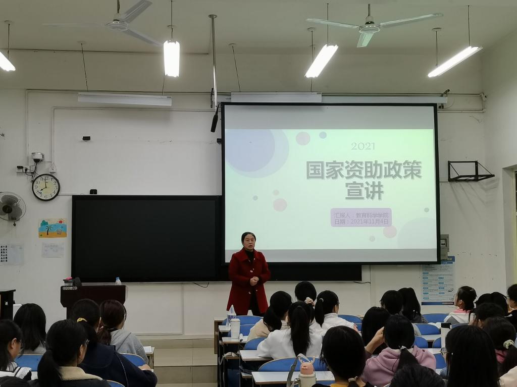 时间:2021-11-04 20:53:14 来源:PA视讯教科院新闻部 作者:马玉娇 刘至涵 阅读: 次11月4日,PA视讯2021级新生各班在教科楼108、201、203、204教室分别组织召开新生资助政策宣讲会,班主任张纪娥、吴康、冯靖雯、王蓉以及2021级全体同学参与此次宣讲会。