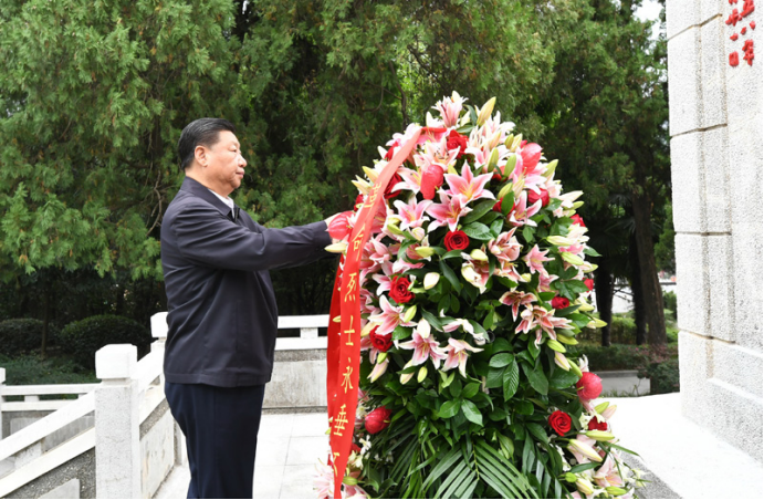 9月16日至18日,中共中央总书记、国家主席、中央军委主席习近平在河南考察。这是16日下午,习近平来到位于信阳市新县的鄂豫皖苏区首府烈士陵园,瞻仰革命烈士纪念碑,向革命先烈敬献花篮。新华社记者 谢环驰 摄