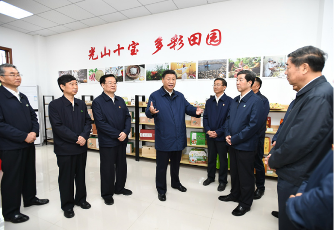 随后,习近平乘车前往光山县西南部的文殊乡东岳村。该村原有建档立卡贫困户145户585人,脱贫攻坚战打响以来,在各方共同努力下,2018年全村实现整体脱贫。习近平来到村文化接待中心,了解光山县脱贫工作和中办在光山县扶贫工作情况。这些年,东岳村大力推进“多彩田园”产业扶贫,成立了村电商服务中心,把村里的农副产品销往全国各地。习近平察看了糍粑、月饼、咸麻鸭蛋、黑猪腊肉、红薯粉条、甜米酒等“光山十宝”和光山羽绒服等特色产品,详细询问产品的市场销路和带动村民脱贫的作用。他强调,要积极发展农村电子商务和快递业务,拓宽农产品销售渠道,增加农民收入。要注意节约环保,杜绝过度包装,避免浪费和污染环境。光山花鼓戏列入了国家级非物质文化遗产代表性项目名录。两名花鼓戏演员给总书记现场表演了一段新编花鼓戏,赢得热烈掌声。