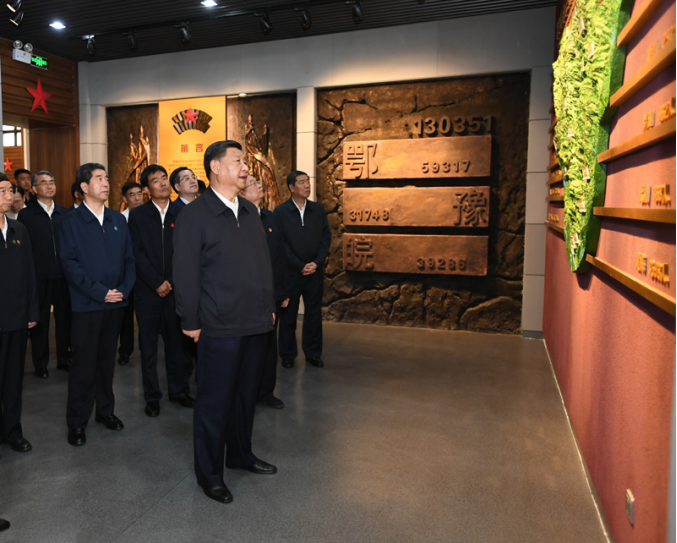 接着,习近平来到鄂豫皖苏区首府革命博物馆,了解鄂豫皖苏区的革命历史。鄂豫皖苏区是中国共产党在土地革命战争时期领导创建的根据地之一,是仅次于中央苏区的第二大革命根据地,诞生了多支红军主力,创造了“28年红旗不倒”的奇迹。解放战争时期,这里是刘邓大军千里挺进大别山的落脚地。博物馆展陈了许多珍贵的革命文物,习近平驻足察看,不时同大家交流,追忆峥嵘岁月。习近平强调,开展“不忘初心、牢记使命”主题教育,党员、干部要多学党史、新中国史,自觉接受红色传统教育,常学常新,不断感悟,巩固和升华理想信念。革命博物馆、纪念馆、党史馆、烈士陵园等是党和国家红色基因库。要讲好党的故事、革命的故事、根据地的故事、英雄和烈士的故事,加强革命传统教育、爱国主义教育、青少年思想道德教育,把红色基因传承好,确保红色江山永不变色。