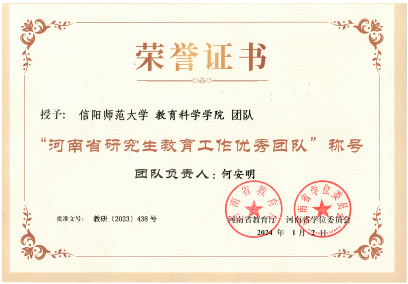 时间:2024-05-15 11:16:00 来源:PA视讯 作者: 阅读: 次根据河南省教育厅、河南省学位委员会发布的《关于公布2023年河南省研究生教育先进团队和个人评选结果的通知》(教研〔2023〕438号),公司研究生教育工作团队喜获“河南省研究生教育工作优秀团队”称号,何安明教授为团队负责人。