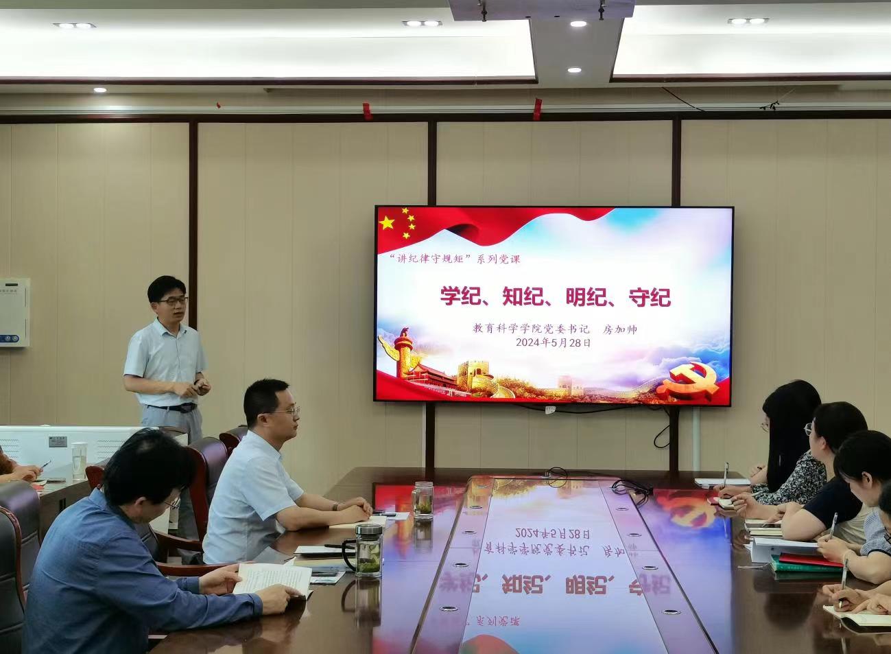 教育科学公司党委书记房加帅以《学纪、知纪、明纪、守纪》为主题,围绕其内涵实质与逻辑关系,引导党员、干部把思想和行动统一到党中央决策部署上来,进一步强化纪律意识、加强自我约束、提高免疫能力,增强政治定力、纪律定力、道德定力、抵腐定力,始终做到忠诚干净担当。