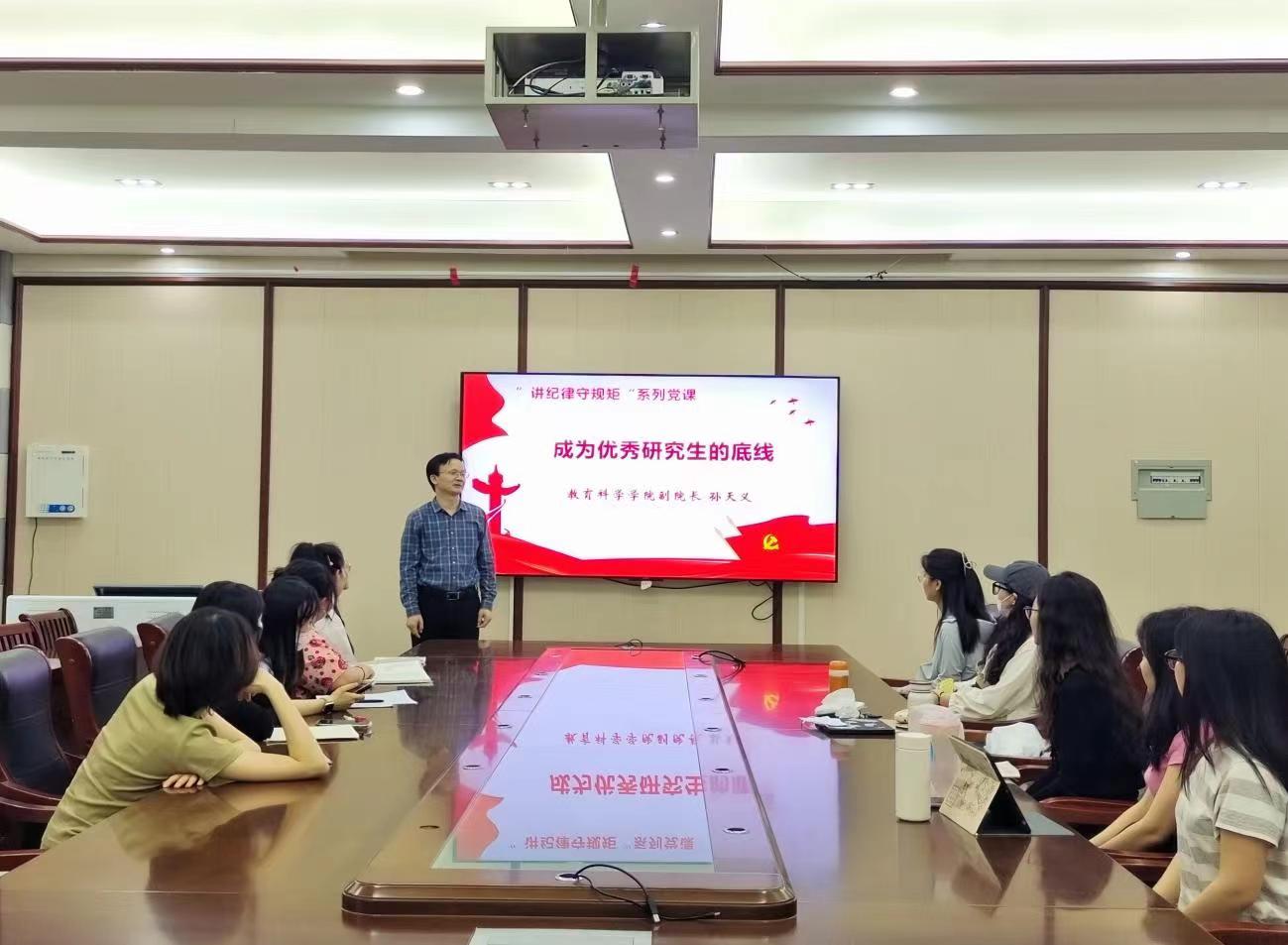 PA视讯副经理孙天义以《成为优秀研究生的底线》为题,结合负面清单和典型案例,强调研究生党员要增强党性修养、保持优良党风、严守党的纪律、推进自我革命,处理好公与私、义与利、纪与情、道与术的关系,明大德、守公德、严私德、传美德,模范遵守法律法规、校规校纪、科研伦理和学术道德。
