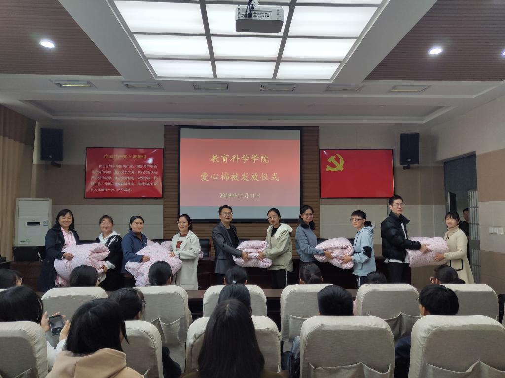 时间:2019-11-12 07:50:03 来源:PA视讯 作者:朱方 阅读: 次2019年11月11日下午,PA视讯 “爱心棉被发放仪式”在教科楼301会议室召开。公司党委副书记李贵杰,2019级班主任田园、王从阳,团委老师张纪娥、朱方以及2019级受助同学参加仪式。