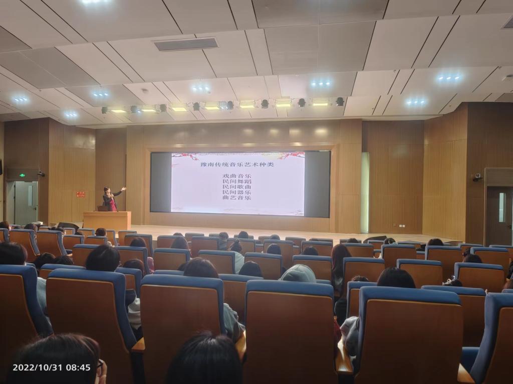 郭德华教授由豫南地区的五种音乐艺术种类作为报告主线,围绕“戏曲音乐”、“民间舞蹈”、“民间歌曲”、“民间器乐”、“曲艺音乐”五个领域进行了深度介绍。郭教授结合信阳独特的地理位置,介绍了戏曲音乐中的豫剧、花鼓戏等主要的豫南戏曲音乐文化;民间舞蹈中的花伞舞、花扇舞;民间歌曲中的号子、山歌、红色民歌等内容。最后,在郭教授与全班同学共同演唱信阳著名红色歌曲“八月桂花遍地开”的歌声中结束了本次的音乐文化报告。