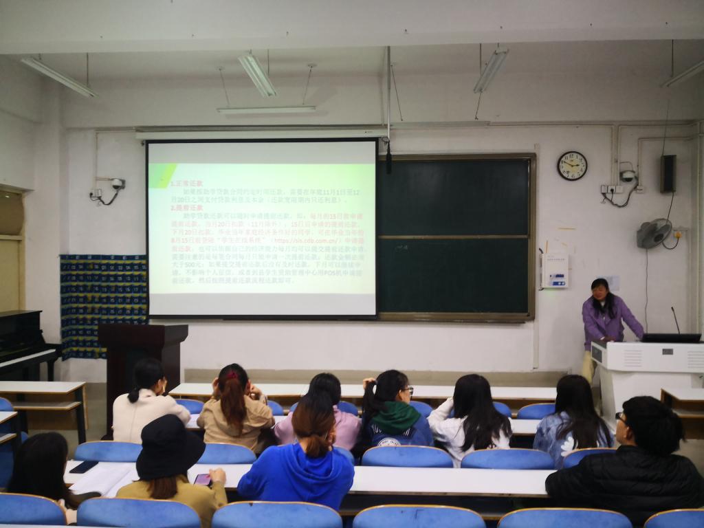 在本次宣讲会上,朱方首先从政策介绍、还款规则、还款方法、毕业确认、应届毕业生考入研究生办理助学贷款展期、个人征信、助学贷款违约后果等方面做了详细地讲解,着重阐述按时还款的重要性和拖欠还款的严重后果;随后组织同学们一起观看诚信还款宣传片,了解良好的个人征信记录带来的巨大便利;最后针对近期出现的员工支付宝账户需升级为成人账户、注销校园贷等骗术,提醒同学们一定要注意警惕此类骗局,不向陌生账户转账,保护自己的财产安全。