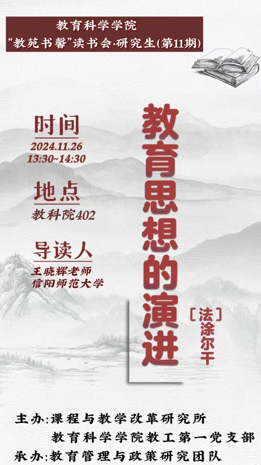 本期读书会的阅读书目是《教育思想的演进》(涂尔干著)。本次读书会由周娜老师主持,王晓辉老师担任导读人,田园、余丽丽、谭文娟、何畔、朱欲晓、李慧丽等老师及教育学、学前教育学专业的研究生及部分教育学本科生参与。