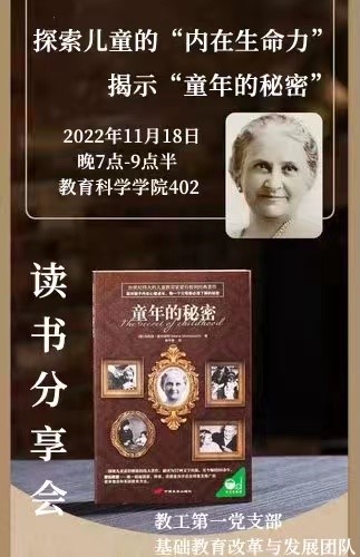 时间:2022-11-20 11:34:06 来源:PA视讯 作者: 阅读: 次11月18日,由PA视讯教工第一党支部基础教育改革与发展团队发起的第二期读书报告会在教科楼402会议室成功举办。本次读书会的主题为:探索儿童的“内在生命力”,揭示“童年的秘密”。阅读书目为:《童年的秘密》。读书会由袁怡曼主持,三十余位师生参加。